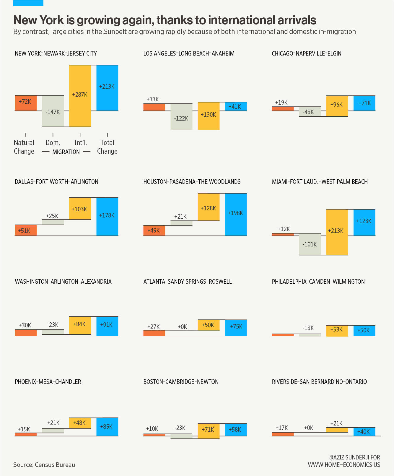 The Census Bureau released 2023-24 population estimates yesterday. The data showed large coastal cities returning to growth after shrinking during the pandemic years. International in-migration was the main driver.