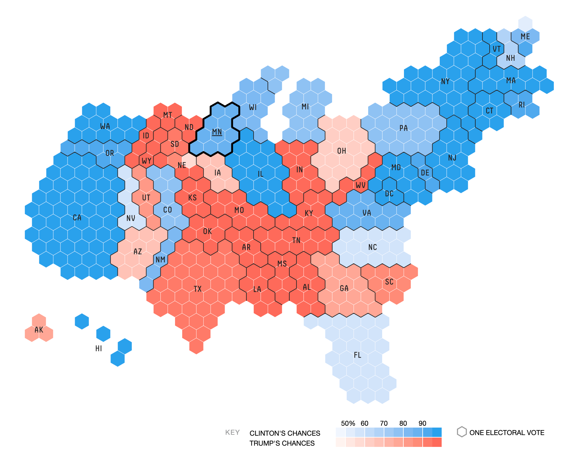 There are solutions to this problem. Hex maps, for example, allocate map space proportionally with population (this map from fivethirtyeight shows electoral college votes). But hex maps look undeniably weird, and only vaguely resemble the country’s actual geography.