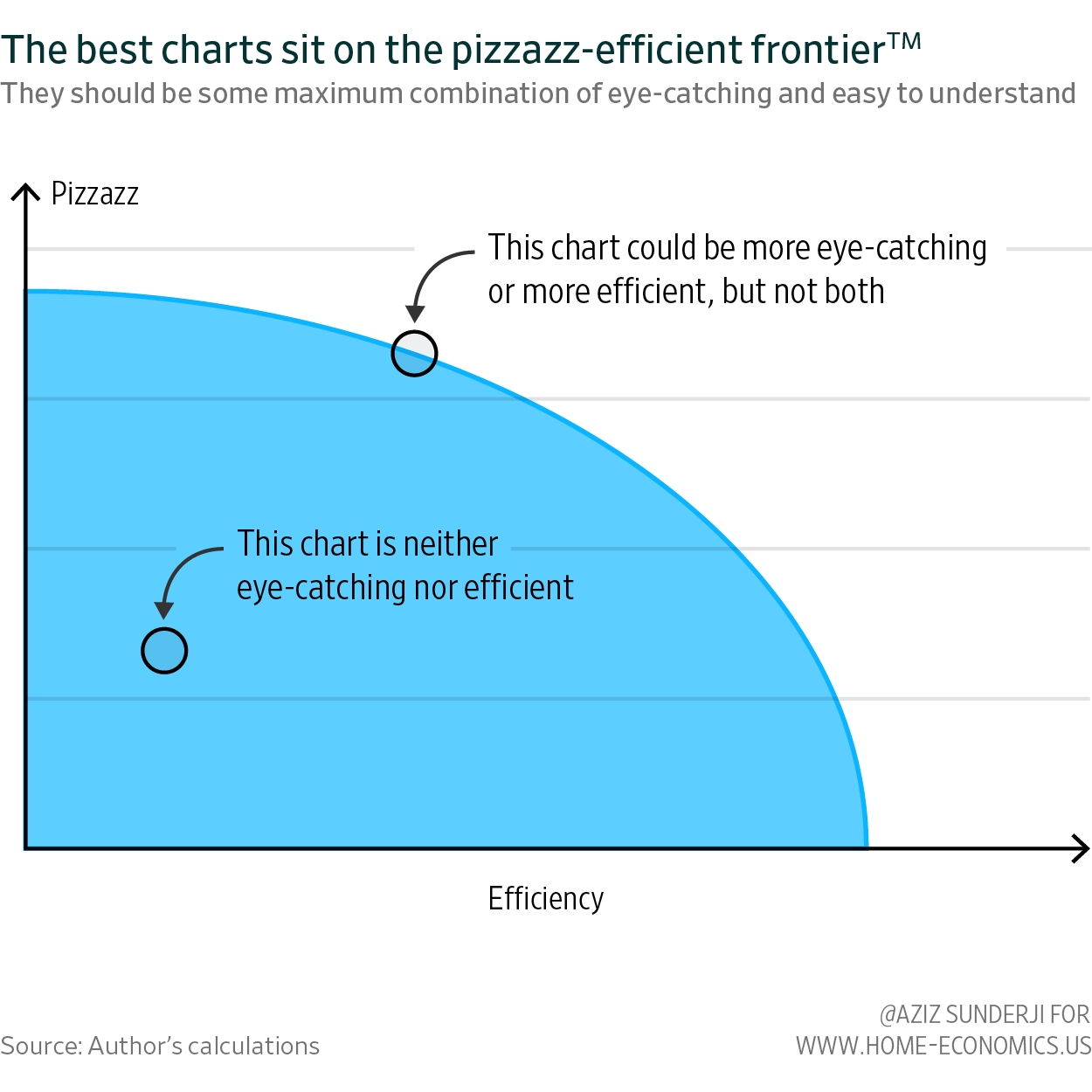 There is no solution, only a way of optimally navigating this tension: charts should be as efficient as possible for any level of pizzazz (the technical term). The best charts sit on the pizzazz-efficient frontier, not within it.